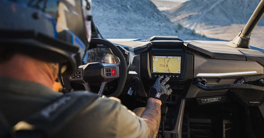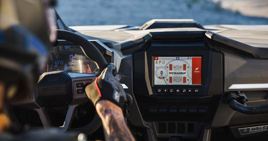 - RIDE COMMAND® 7” Glove-Touch Display: DYNAMIX 2.0 Visualizer, Built-In GPS, Group ride (cell-based or GPS based), Topographic Mapping, Bluetooth & USB Smartphone Connectivity, AM/FM & Weather Radio, In-Vehicle Communications Capable With Optional Sena Headsets, Polaris P.A.S.S Anti-Theft System. Dual-sweep Analog Dials w/ 4" LCD Rider Information Center: User Selectable Blue/Red Backlighting & Brightness, Programmable Service Intervals. Digital Instrumentation: Speedometer, Tachometer, Odometer, Tripmeter, Clock, Hour Meter, Gear Indicator, Fuel Gauge, Coolant Temperature, Voltmeter, Service Indicator and Codes, Seat Belt Reminder Light, Gear Indicator, DC Outlet.