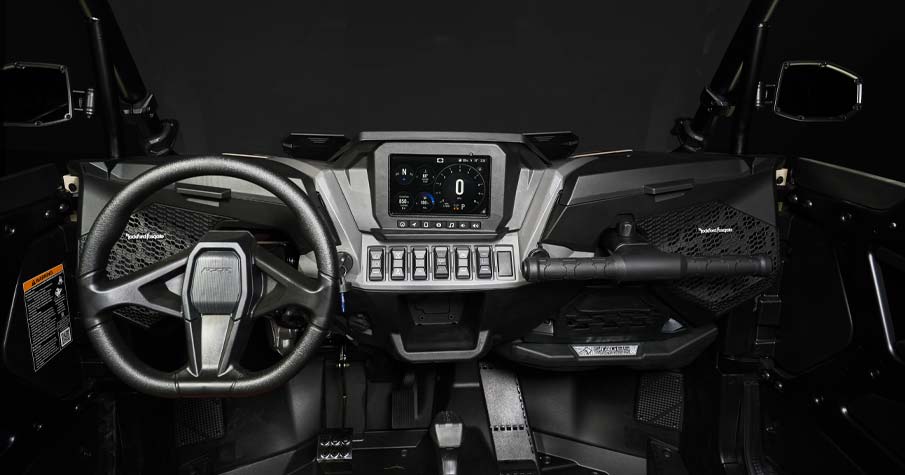 - Color Matched Seats Programmable Speed Limiting PIN Enabled Engine Start Security 660-W Charging System @ 3,000 RPM 6-Position PULSE Bar Front Tow Loop Front Bumper Passenger Grab Handle with Integrated Lug Nut Hex Wrench Driver and Passenger Dash Storage Bins